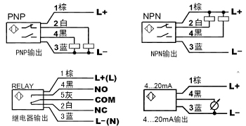 2、信號(hào)輸出:PNP,NPN,繼電器,模擬量(4~20mA